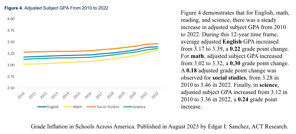 Fundamentally, an A should represent true excellence, not mediocrity. To learn more about grade inflation as a nationwide issue, I recommend reading this New York Times article and this ACT research report.