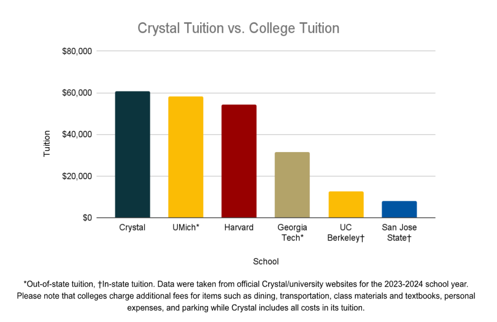 Crystal’s tuition for the 2023-2024 academic year is $60,850. This is $6,581 more than Harvard College and nearly 5 times as much as UC Berkeley, our state’s flagship institution and a world-renowned research university. Here’s a visualization of Crystal’s tuition compared to several colleges across the nation: