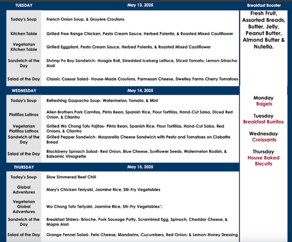 Chef Angel does the dietary restrictions himself because “he wants to make sure there are no errors or mistakes.” The items in the kitchen are also nut free to prevent any cross contamination. The team also works hard to separate gluten items and gluten-free products in order to also make sure that there are no mix ups. There is also a vegetarian option for those who don’t eat meat. Also for each meal, it tells you if the food contains dairy, nuts, etc.