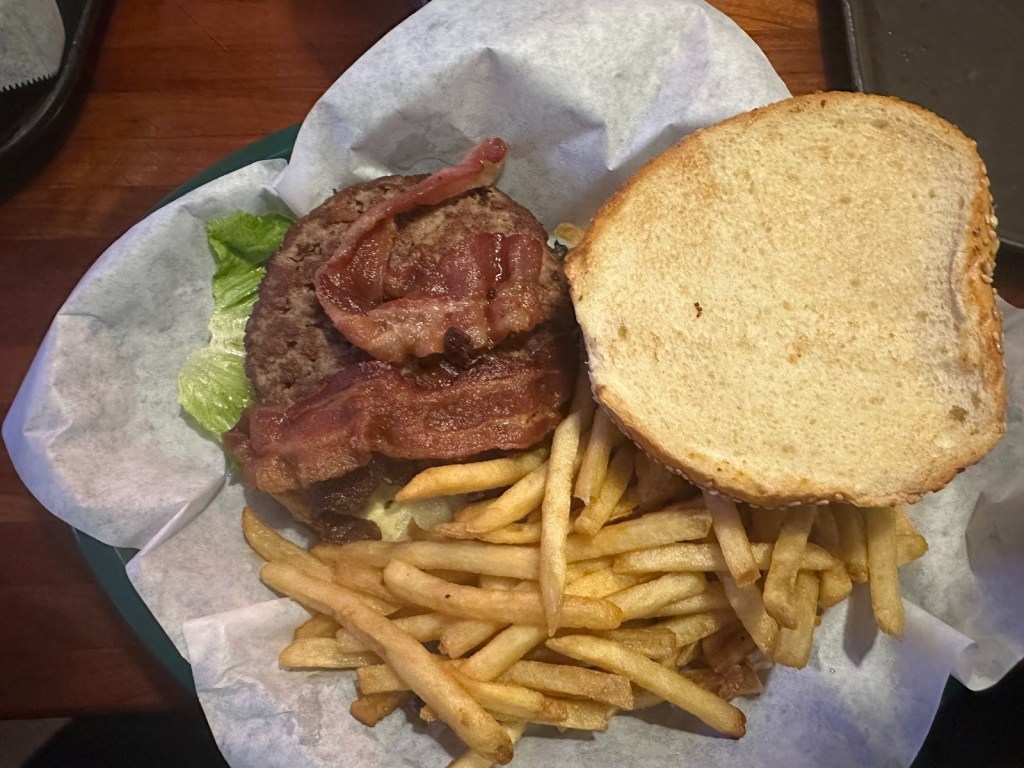 I have been going to the Dutch Goose since before I could recite the alphabet, but this was my first time trying their highly praised burger. It saddens me to admit that it was by far the worst burger on the list, despite having waited 30 minutes for it. Despite having bacon, a secret sauce, onions, lettuce, and tomatoes, the burger’s flavor could only be described as an overwhelming amount of mustard. This was most likely due to the severity in the strength of the secret sauce, which also had a strong mayo and relish flavor on top of the mustard. It was no wonder that the sauce overtook the burger once I realized how thin the patty was as well as how well done it was. As for the rest of the toppings, the lettuce lacked crunch, and the tomatoes tasted watery. The only thing saving the burger was the bacon, which I must admit, had an excellent crunch. However, it was far from enough to make up for the rest of the meal. In contrast to the soulless burger, the bar was buzzing along with the rest of the atmosphere. The restaurant features a classic arcade section, numerous images on the wall, and a wide range of sports. While it may not serve the best hamburger, it offers other good options and is a great place to visit with friends, especially for a big sports game.