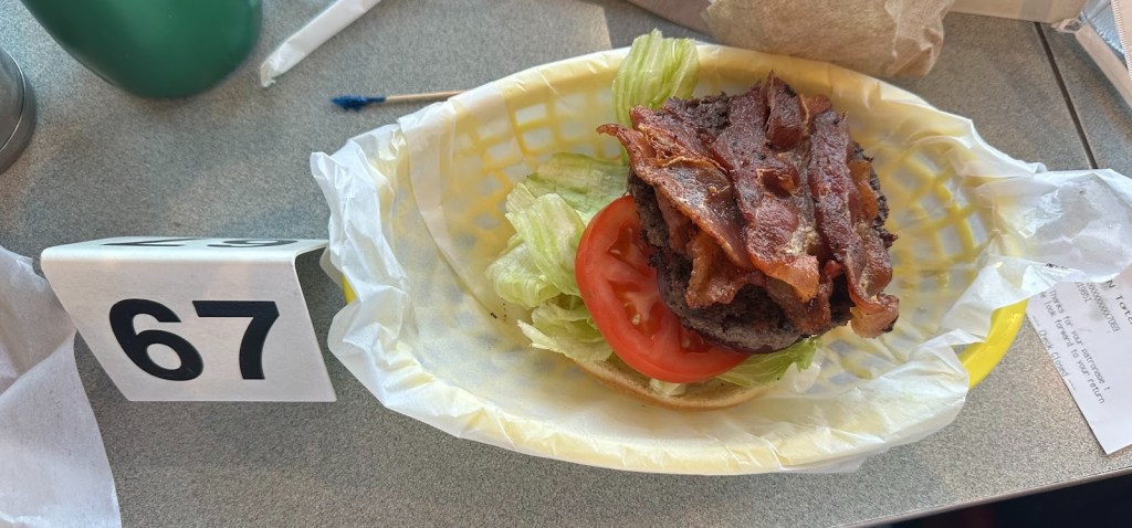 Now for the renowned Jeffrey’s Hamburgers. Everybody at Crystal knows this place for its traditions, from sports teams to the musical. But despite being here for a team dinner, I had to try to set tradition aside and focus on the burger. After paying more than anyone would want for just a burger and a milkshake, I waited. After only 5 minutes, the server came with our burgers, and my team and I assessed them. The size of the burger was underwhelming considering its price, but the toppings did look appetizing. The tomatoes were bright red and juicy, the bacon looked perfect, and the lettuce was crunchy. As for the flavor, the burger was well done despite being ordered medium well, and the bacon was a little chewy. However, the toppings easily made up for these flaws, and as always, the environment was perfect. So while the tradition of the iconic restaurant may have impacted my assessment of the burger, I think it is fair to say that the tradition is just as much a part of this burger as the patty and bun.